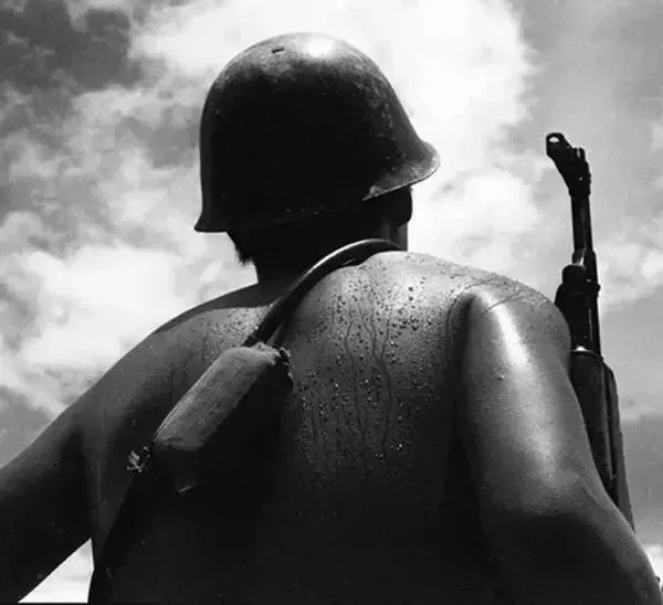 他以赤膊士兵背上的汗珠作為照片聚焦點,鋼盔與步槍交代了人物身份