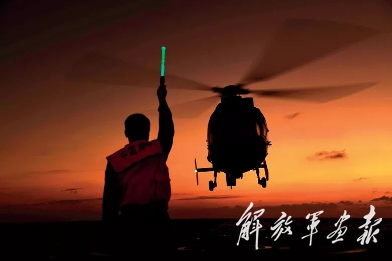 下圖為一張艦載直升機跨晝夜著艦訓練的照片