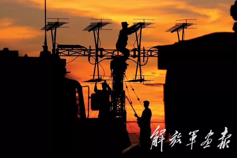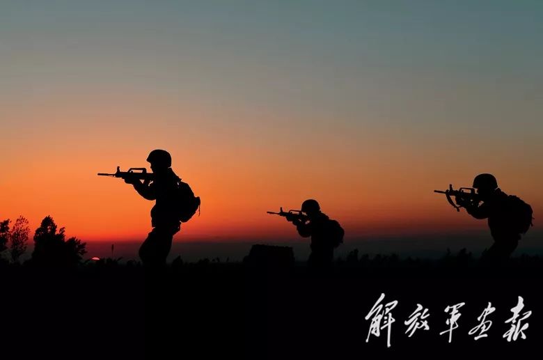夕陽西下,士兵們披著霞光,緊握鋼槍守護著萬家燈火。