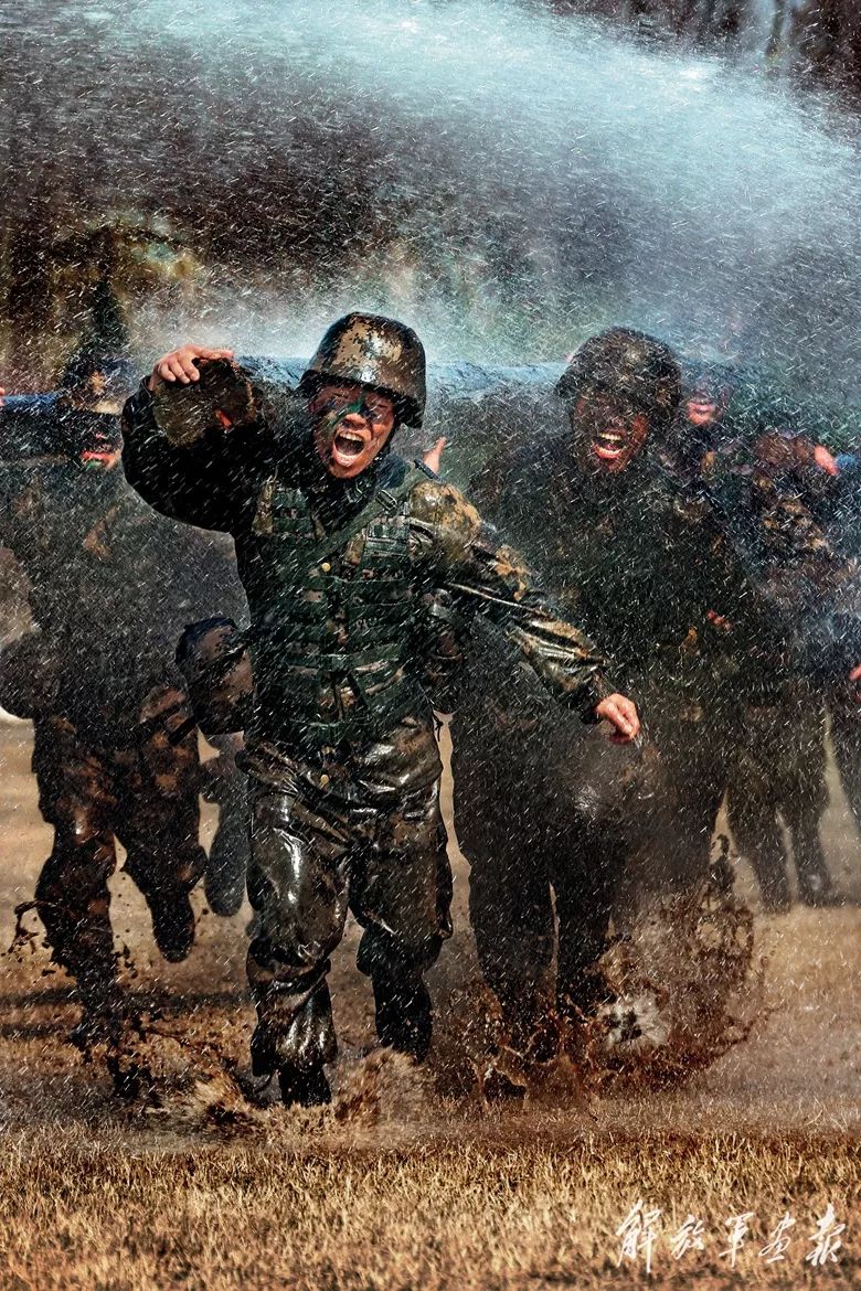 下圖,攝影師采用高速快門來抓拍士兵臉上怒吼的表情,利用右側噴射的水花,腳下濺起的泥水來襯托士兵勇猛向前的氣勢。