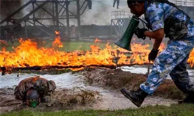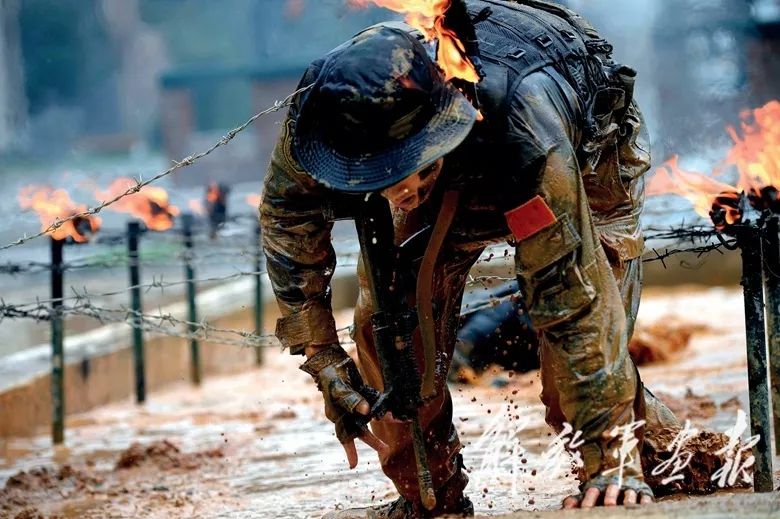 背景的烈火,污濁的泥潭,嚴厲的教官,左下角的士兵以最標準的匍匐姿態(tài)完成每一個訓練動作,體現(xiàn)部隊訓練的嚴格性。