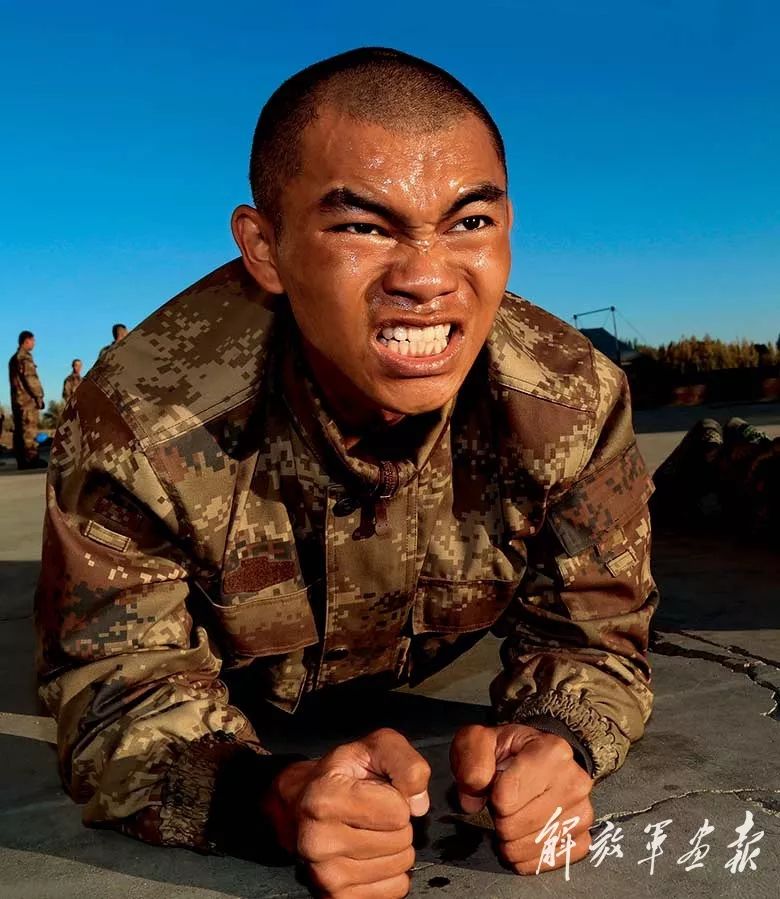 新兵臉上的汗水以及豐富的面部表情讓這張人物特寫照片看起來特別生動