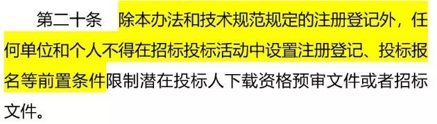 其實(shí),在此之前,國家發(fā)改委和住建部等八部委公布的第20號(hào)令《電子招標(biāo)投標(biāo)辦法》中,就明確規(guī)定:除本辦法和技術(shù)規(guī)范規(guī)定的注冊(cè)登記外,任何單位和個(gè)人不得在招標(biāo)投標(biāo)活動(dòng)中設(shè)置注冊(cè)登記、投標(biāo)報(bào)名等前置條件,限制潛在投標(biāo)人下載資格預(yù)審文件或者招標(biāo)文件。